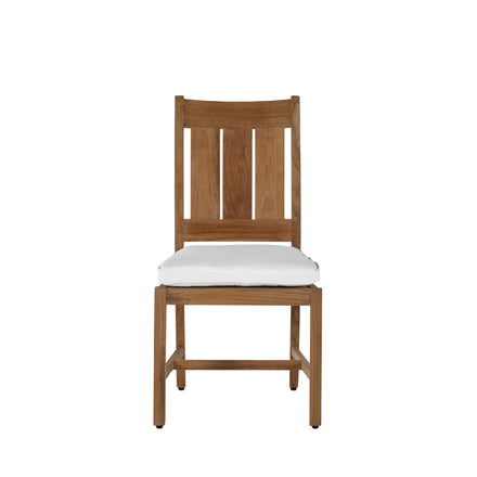 The Croquet Dining Side Chair exudes timeless charm and resilient construction, ideal for year-round enjoyment. Crafted with Indonesian teak, known for its durability and natural weather resistance, it's built to last with classic mortise-and-tenon joinery. The back of the chair is constructed with sturdy teak slats, offering robust support. Flat armrests ensure comfort, while the custom-fitted seat cushion, in Linen Dove, provides an extra touch of luxury, making this chair a sophisticated and inviting choice for any outdoor dining setting.