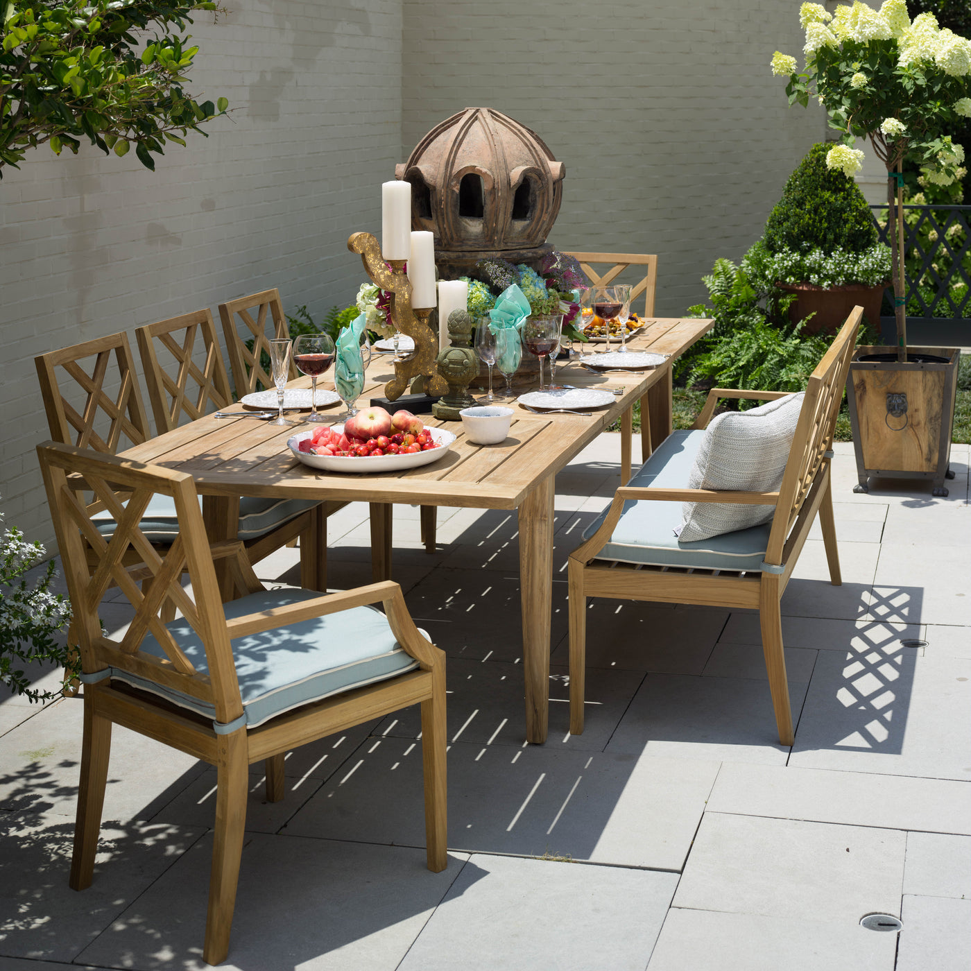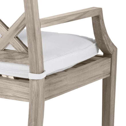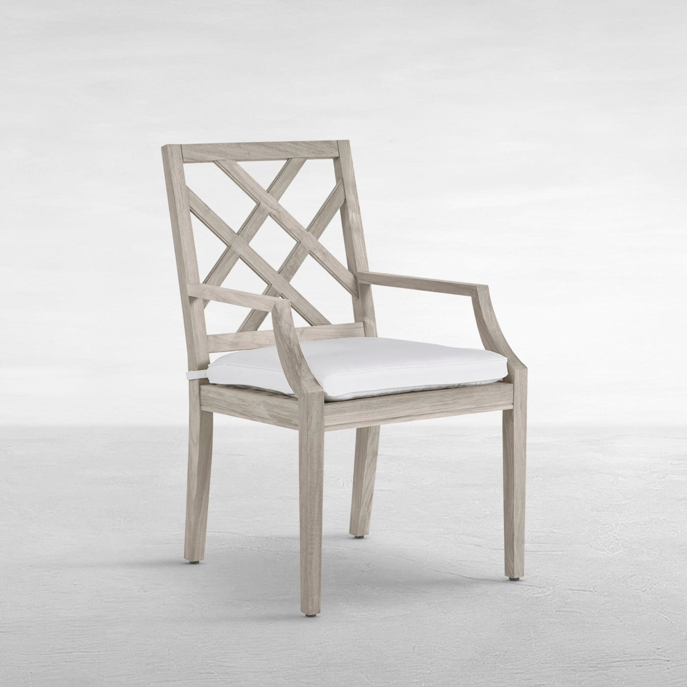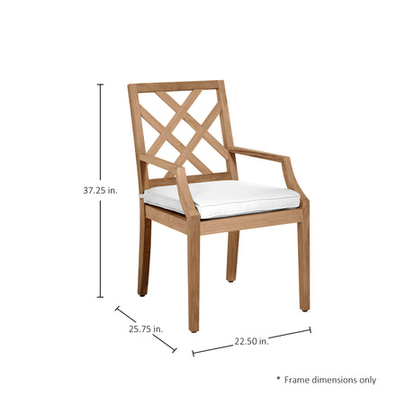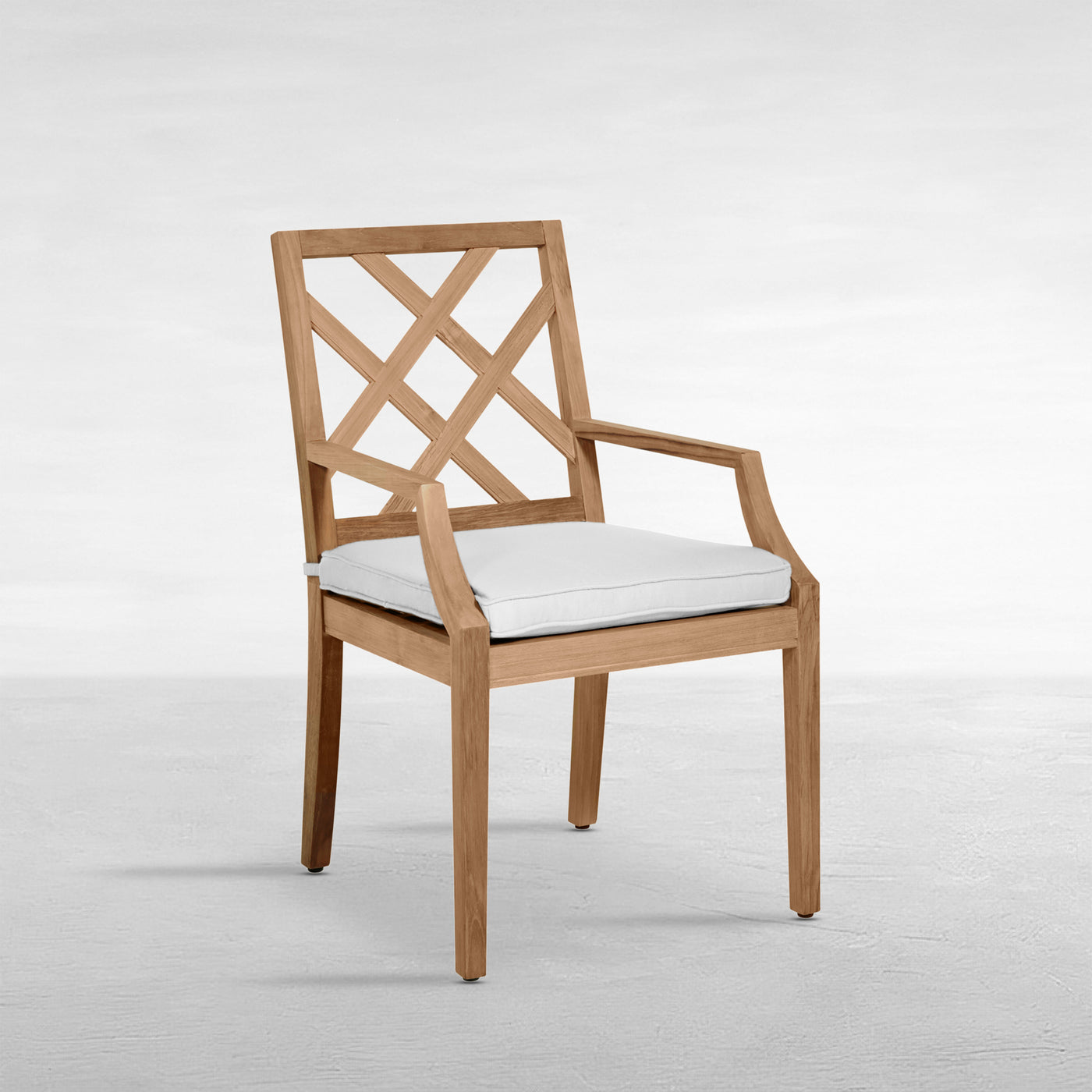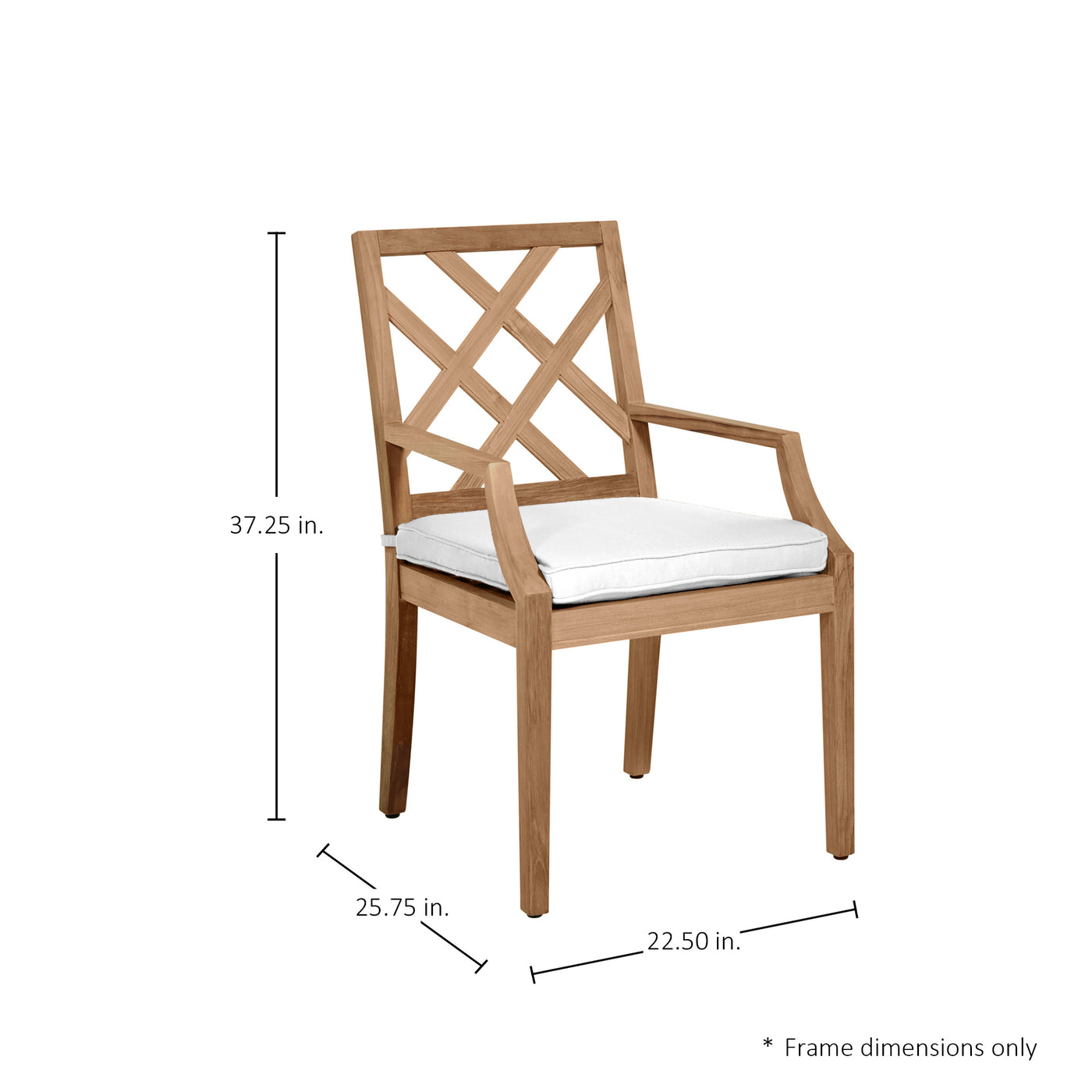 The Haley Teak Arm Chair is a classic. Made of durable, Indonesian teak, it features a traditional latticework back and finely detailed armrests. The simple elegance of the Haley Arm Chair makes it a perfect choice for any outdoor dining room. Embrace the lasting luxury of this Indonesian teak furniture, knowing that it hails from FSC-certified sources committed to ecological stewardship. This item is designed to be enjoyed either with or without a cushion. Please designate your choice in the below "Select a Cushion" dropdown.