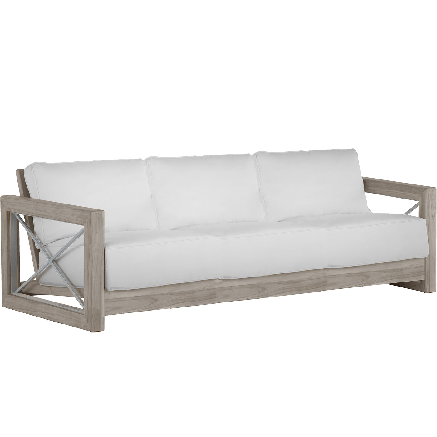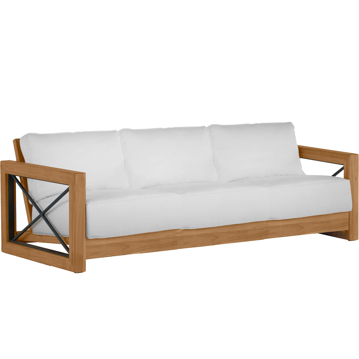 The Malta Teak Sofa, inspired by the Mediterranean's traditional allure, features clean geometric lines and an airy aluminum x-pattern along the sides. Crafted from slow-growth plantation teak, it blends old-world charm with contemporary sophistication, and is known for its durability and natural resistance to the elements, ideal for outdoor furniture. Sourced from FSC-certified Indonesian plantations, this chair reflects a commitment to sustainability. Topped with ultra-deep Dreamâ„¢ Cushions, it offers unparalleled comfort. The high-performance outdoor fabric cushions are resistant to fading, moisture, and mildew, ensuring long-lasting beauty and functionality. For those seeking to elevate their outdoor living area, this sofa provides a harmonious blend of aesthetic appeal, comfort, and durability.