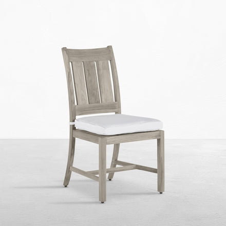 The Croquet Dining Side Chair exudes timeless charm and resilient construction, ideal for year-round enjoyment. Crafted with Indonesian teak, known for its durability and natural weather resistance, it's built to last with classic mortise-and-tenon joinery. The back of the chair is constructed with sturdy teak slats, offering robust support. Flat armrests ensure comfort, while the custom-fitted seat cushion, in Linen Dove, provides an extra touch of luxury, making this chair a sophisticated and inviting choice for any outdoor dining setting. This item is available through our Quick Ship program in the specific frame finish, fabric option, cushion type, and fill shown. Quick Ship pieces are ready to ship within 72 hours, ensuring you receive your selection faster without compromising on quality.
