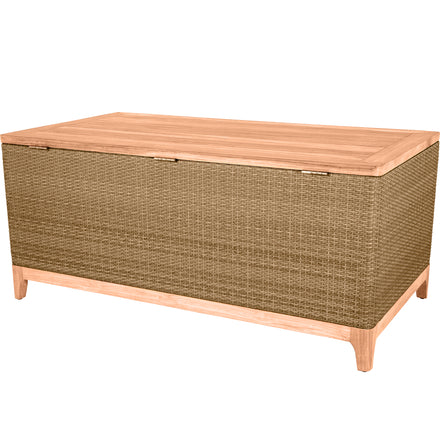 The Chesapeake Storage Box is a perfect blend of style and functionality, designed to enhance your outdoor living space. Crafted with a sturdy teak wood frame and our exclusive handwoven N-Dura™ resin wicker exterior, it offers a natural, elegant look that complements various outdoor decors. The slatted teak wood lid is not only aesthetically pleasing but also provides natural oils that repel water, making it highly resistant to moisture and preventing it from cracking or becoming brittle over time. These oils also protect the wood from insects and termites. This storage box is spacious, providing ample room to store outdoor cushions, pillows, and other essentials, keeping your patio neat and organized. Additionally, the interior features compartments and removable panels for organized storage. Its robust construction and elegant appearance ensure it will be a lasting and attractive solution for your outdoor storage needs.