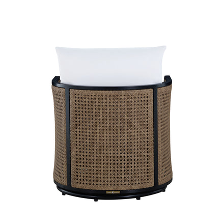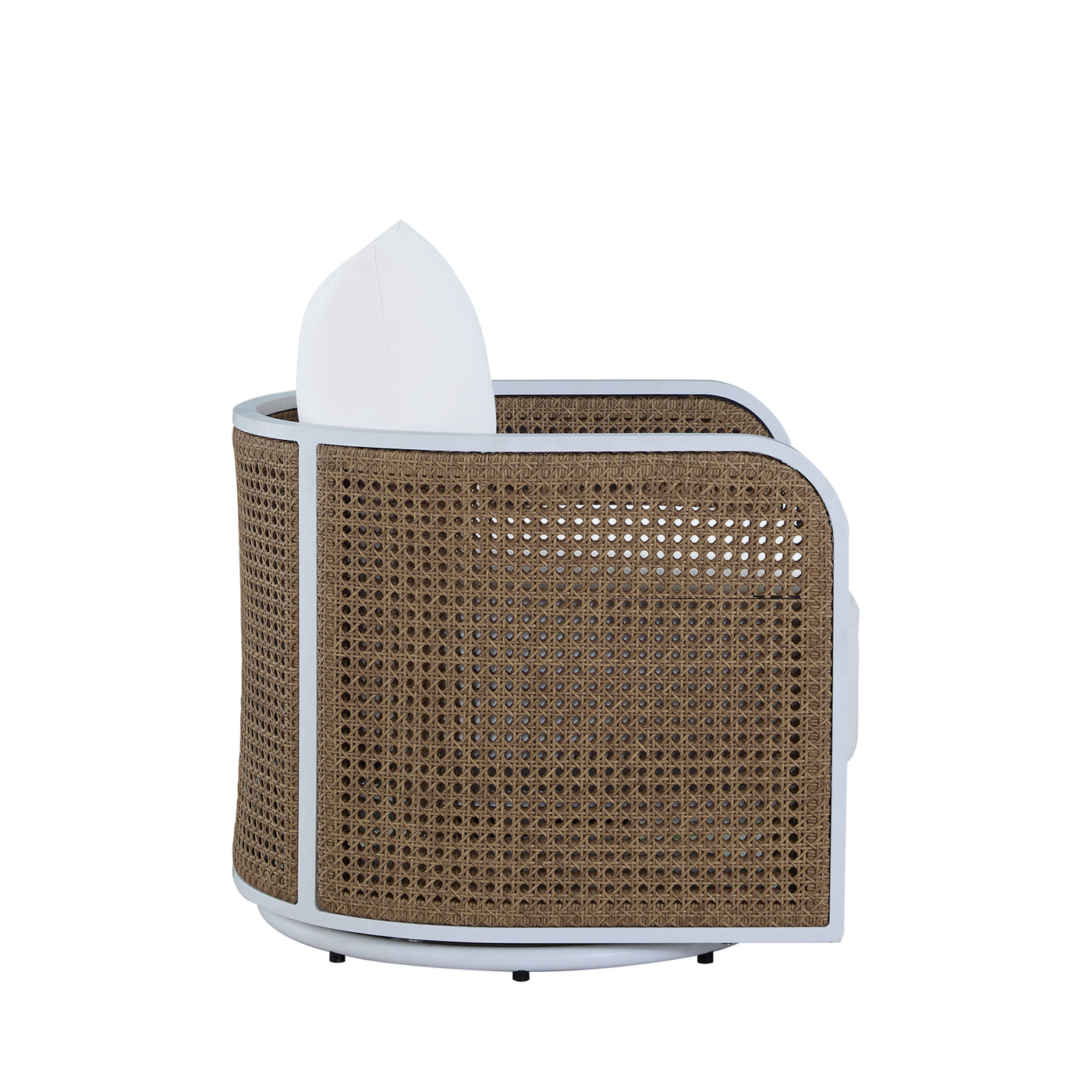 The Havana Swivel Lounge brings motion and comfort to the collection’s signature blend of nostalgic charm and modern craftsmanship. Featuring handwoven, all-weather N-Dura™ resin wicker in a classic open cane pattern, it pays tribute to traditional Cuban design while offering exceptional outdoor durability. Set within a sleek, powder-coated aluminum frame with gently rounded corners and mid-century modern cues, this lounge chair rotates smoothly 360 degrees—perfect for relaxed entertaining and conversation. With its plush cushions and rich texture, the Havana Swivel Lounge delivers timeless style with contemporary comfort for any outdoor retreat.