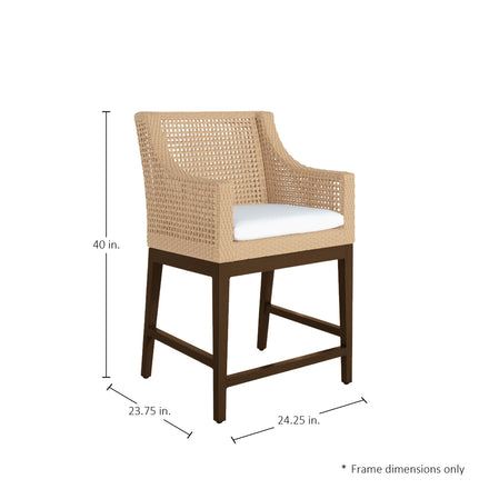 Elevate your outdoor dining experience with the Peninsula Counter Stool, the latest addition to our Peninsula collection. This piece embodies the essence of open-air living with its light and airy open-weave design, crafted from ultra-realistic Raffia resin wicker. Not only does it offer the visual appeal of natural materials, but it also provides the durability and easy maintenance required for year-round enjoyment. Designed with both style and comfort in mind, featuring armrests and a cushioned seat that invites you to linger longer over meals and conversations. Its sturdy construction ensures it can withstand the elements, making it a perfect choice for any outdoor setting. This item is designed to be enjoyed either with or without a cushion. Please designate your choice in the below "Select a Cushion" dropdown.