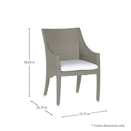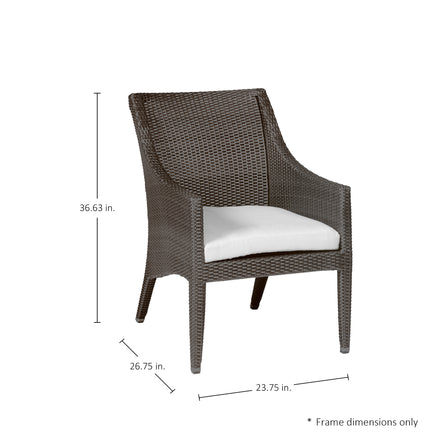 The Athena Arm Chair brings timeless beauty to outdoor spaces. This wicker patio chair features an aluminum frame completely covered by weather-resistant N-Duraâ„¢ resin wicker for durability and strength. A removable seat pan and anodized aluminum feet help ensure long-lasting good looks and enjoyment.