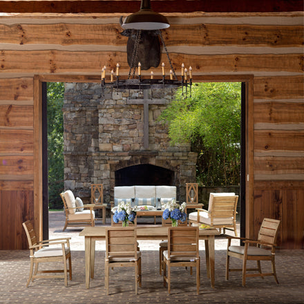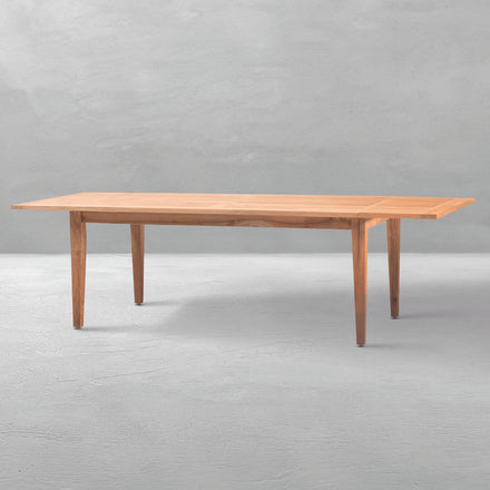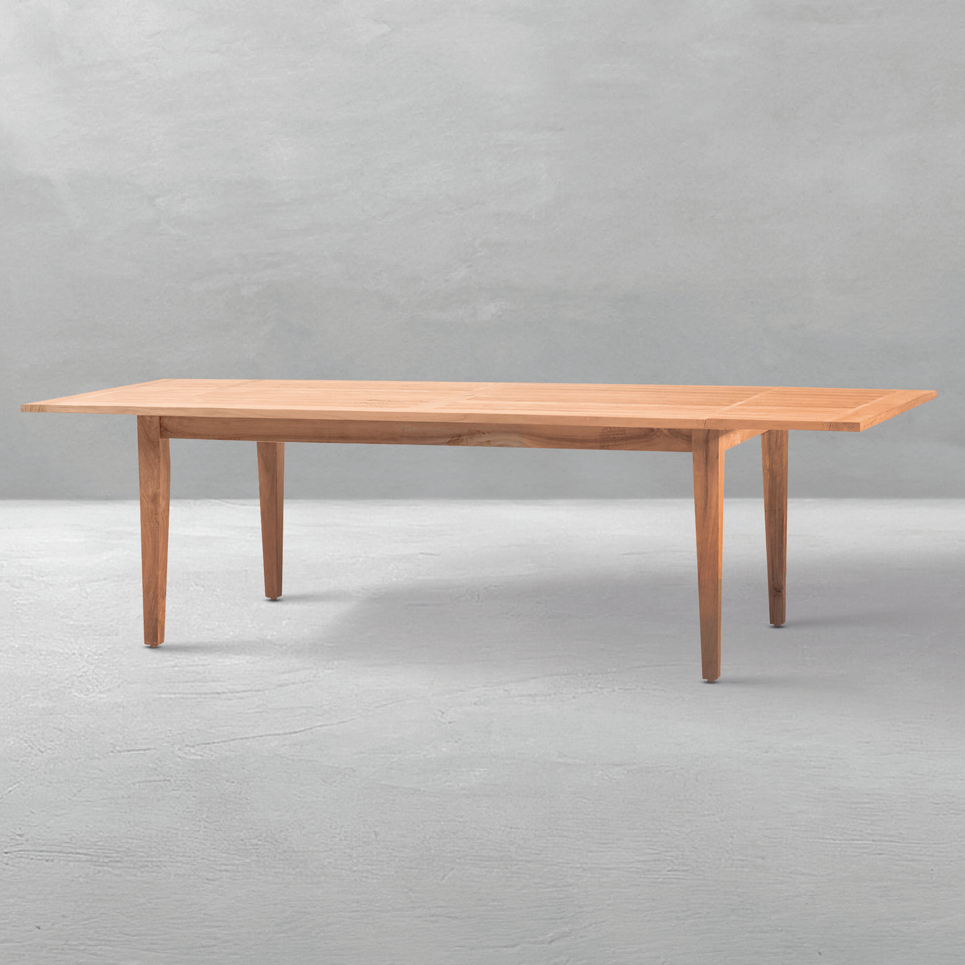 The Teak Extension Farm Table with Umbrella Hole is one of our largest outdoor dining table, measuring 42" x 118". This table is crafted from premium Indonesian teak, which is both FSC and SVLK certified, ensuring it is sourced responsibly. The design features clean, modern lines with a substantial tabletop and sturdy tapered legs, offering a sophisticated yet rustic look. The extension capability allows for versatile use, accommodating larger gatherings with ease. The inclusion of an umbrella hole adds practicality, making it perfect for shaded outdoor dining. Comfortably seating 10-12 people, its an ideal choice for large gatherings and outdoor entertaining. Its robust construction and elegant design make it a centerpiece for any outdoor dining space, combining functionality with environmental responsibility.