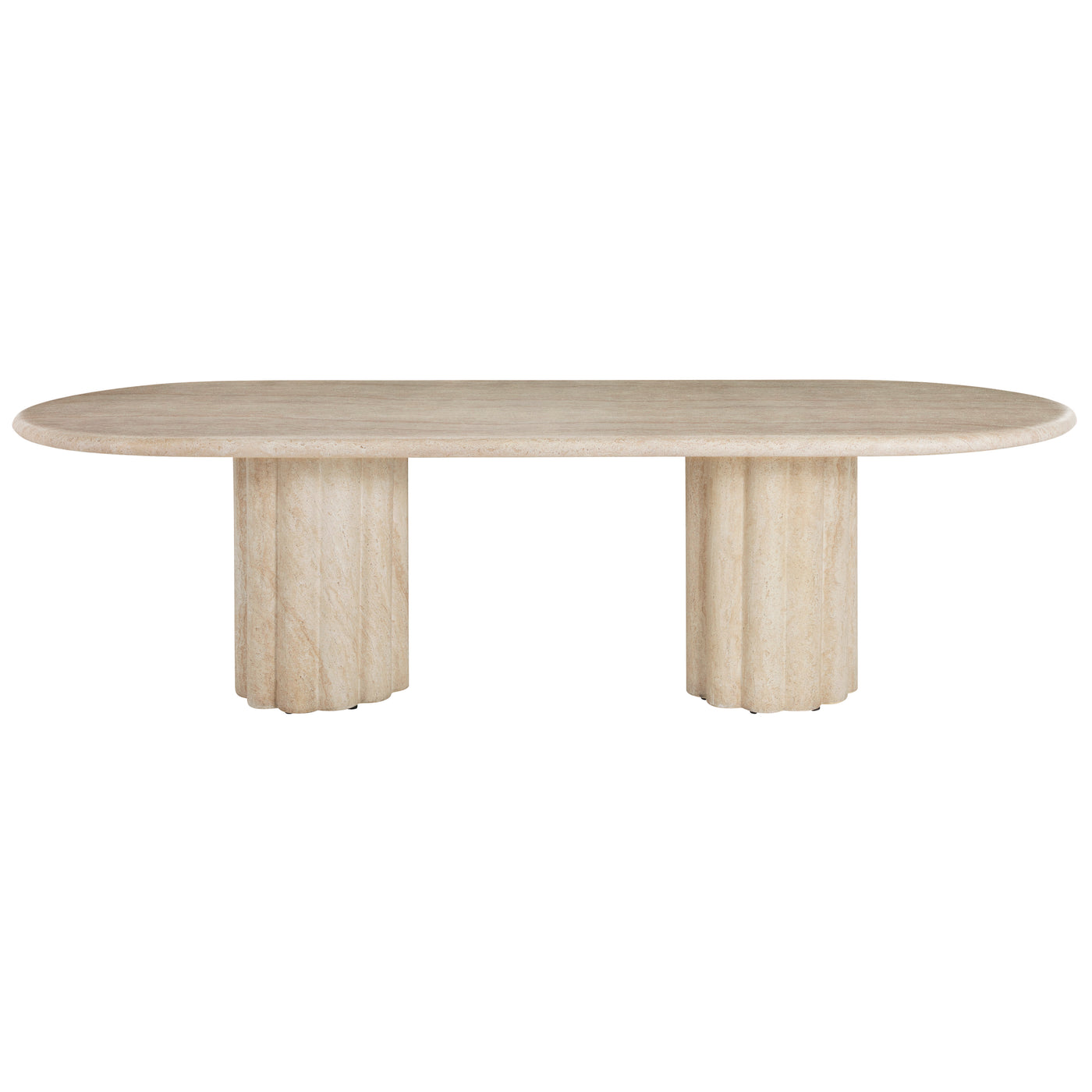 Sculptural yet streamlined, the Delphi Oval Dining Table offers an inviting centerpiece for gatherings. Its gently scalloped base flows seamlessly to the ground, balancing the strength of stone with the graceful fluidity of hand-carved craftsmanship. Made from our expertly crafted cast stone material—a blend of natural crushed stone and specialized binder—it’s designed for enduring strength and beauty in any environment. The new Roman Travertine finish enhances its organic appeal, recreating the depth and nuance of real travertine with stunning realism. With a soft-edged tabletop and refined presence, this table brings sculptural serenity to dining spaces indoors or out.