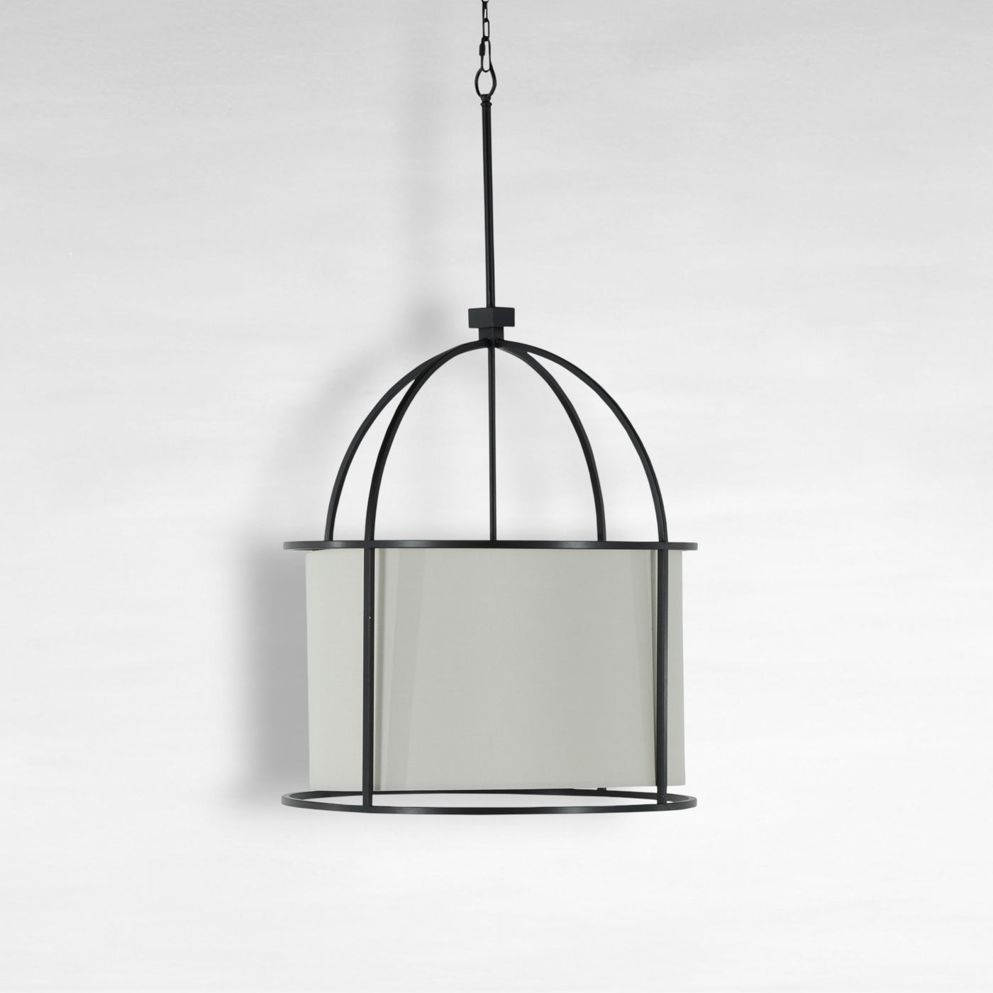 - Black-coated stainless steel with sleek fabric drum shade nestled within a rounded metal frame for a sturdy yet refined build