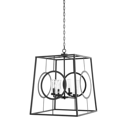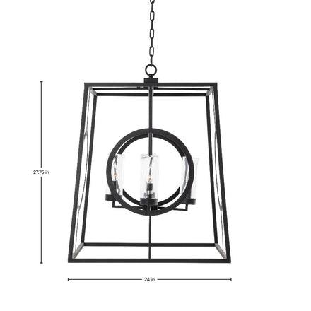 The Omar Outdoor Chandelier features a contemporary design with a black-coated stainless steel frame, ensuring durability and style. The geometric structure includes a trapezoidal frame with circular accents, adding a modern touch to any outdoor setting. Designed to withstand direct water exposure, this chandelier is perfect for outdoor use. It comes with a 12-foot chain, providing flexible installation options. The chandelier uses four light bulbs, each with a maximum wattage of 40 watts, offering ample illumination for outdoor spaces. This 24"x24"x31" fixture combines modern aesthetics with practical functionality, making it a stylish addition to larger outdoor areas.