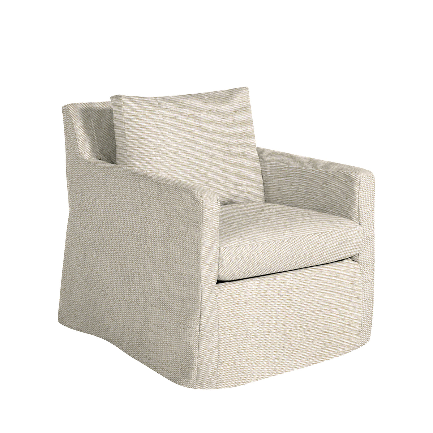 Discover the SC Tailored Nora Swivel Lounge, inspired by our best-selling Balwin Lounge in our Gabby upholstery line, but with a lower back rest for a more relaxed profile. This slip-covered lounge fuses elegance with outdoor resilience, offering a cozy retreat on your porch. Made with marine-grade plywood and enveloped in UV-resistant fabric, it ensures comfort and durability. The Nora collection's versatile design and easy maintenance make it an ideal choice for outdoor living, enhancing any space with its understated sophistication.
