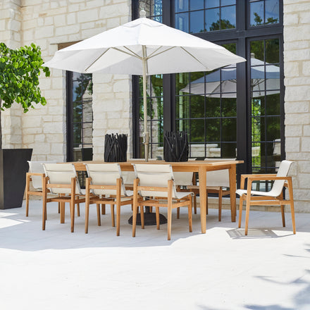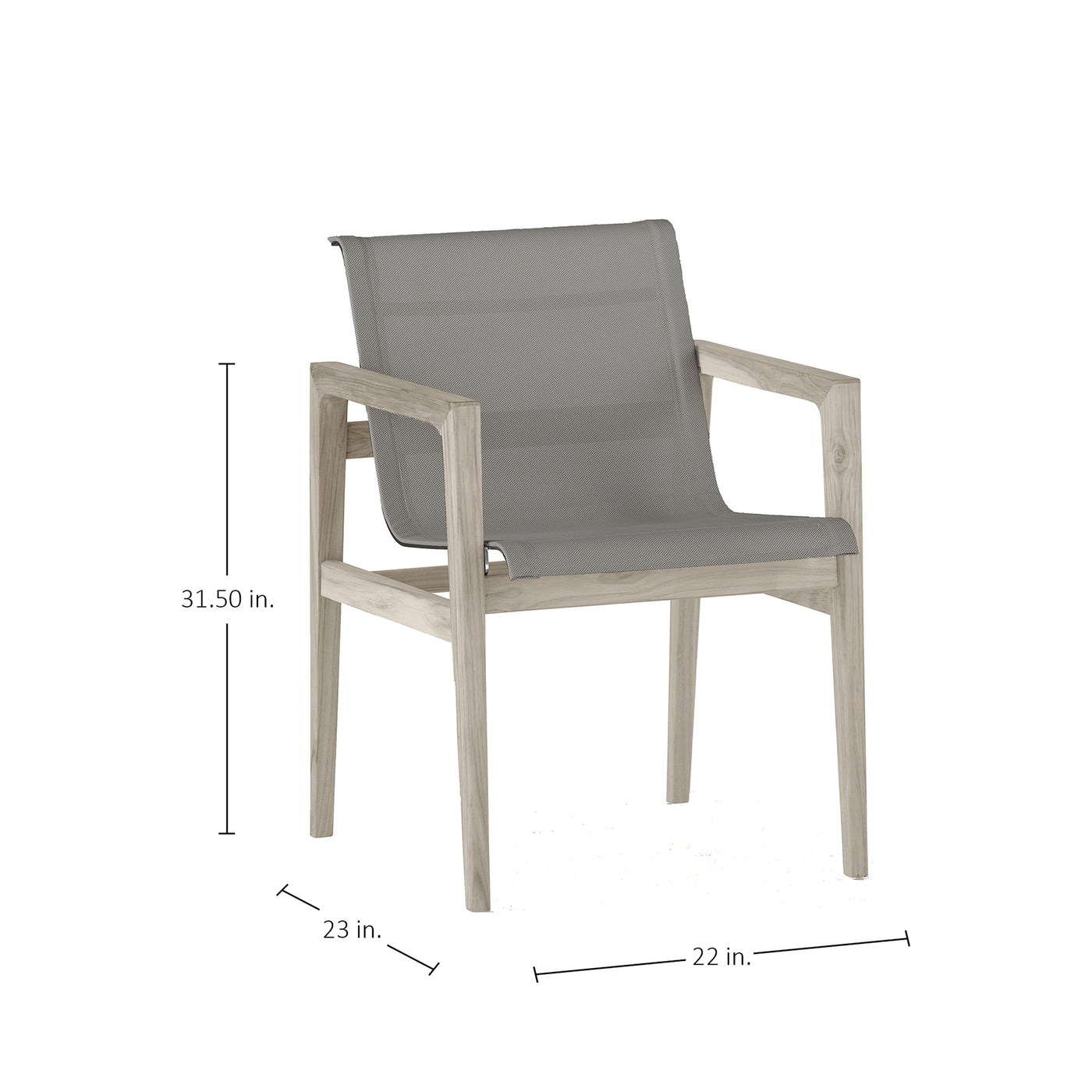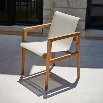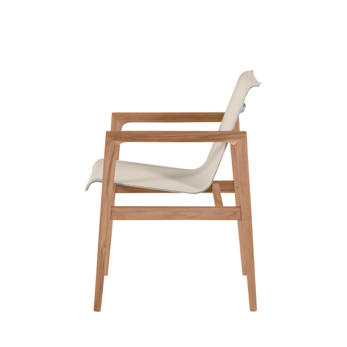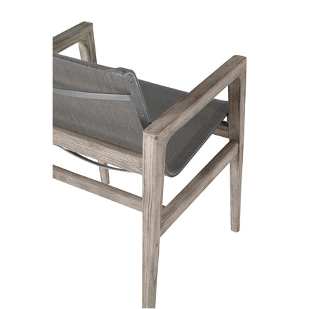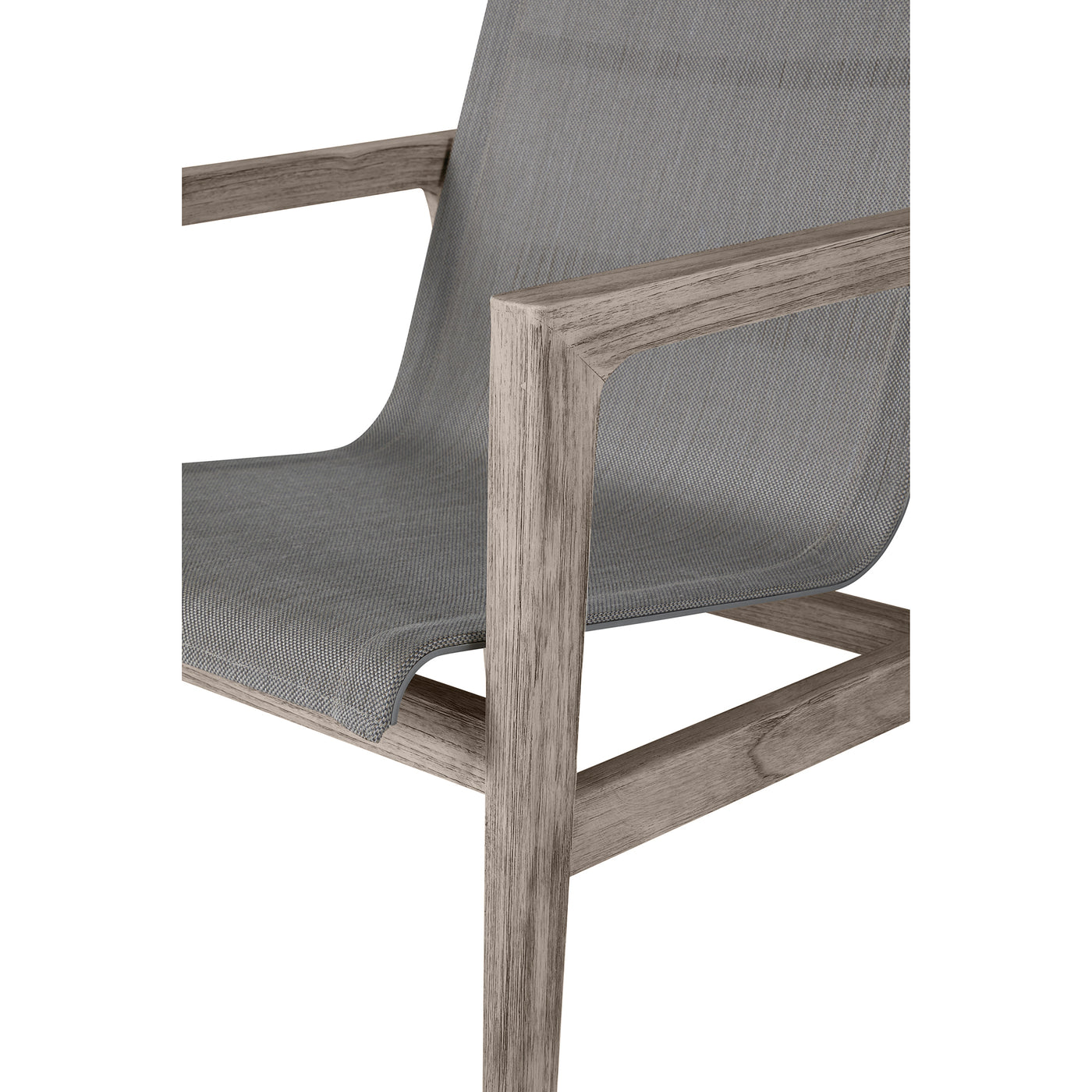 The Coast Teak Arm Chair is a harmony of durability and sustainable design. Teak is highly valued for its exceptional toughness and natural oils that repel moisture, making it an ideal wood for outdoor patio furniture. It's not just strong but also sourced sustainably, ensuring environmental responsibility. The chair's Batyline performance sling offers a comfortable, enduring seat that withstands weather extremes with ease. This armchair is perfect for those who appreciate the lasting quality and want to create a stylish yet practical outdoor space for dining, relaxation, or socializing.