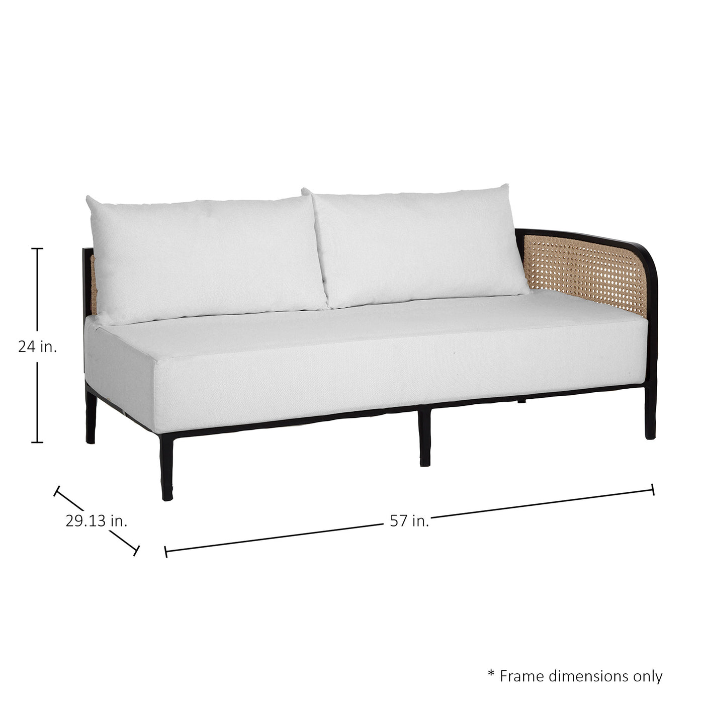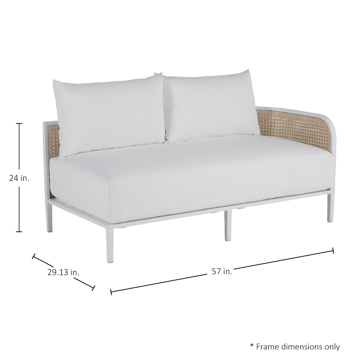 The Havana Right-Arm Facing Loveseat embodies contemporary elegance with its clean design and comfortable seating. Ideal for creating a customized seating arrangement, this piece pairs effortlessly with the Havana Corner Piece, allowing for a versatile outdoor set-up tailored to your space. This piece features a gently curved wrought aluminum frame that embodies the spirit of mid-century modern design, while the all-weather, natural handwoven N-Duraâ„¢ resin wicker recalls the open cane weaving characteristic of old Havana. Its inviting cushions and durable frame ensure a combination of lasting style and relaxation, perfect for enjoying the outdoors in refined comfort. Together, these pieces offer an inviting corner for you to unwind in the fresh air with family and friends.