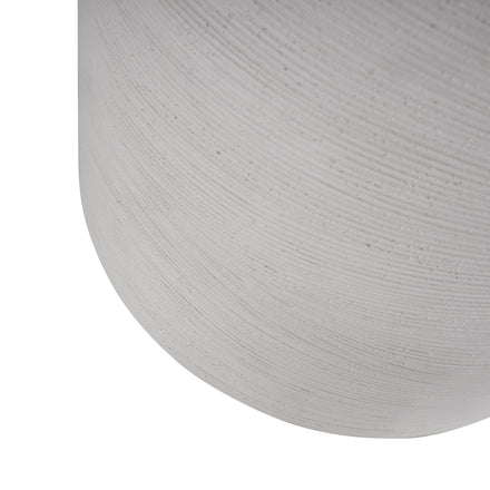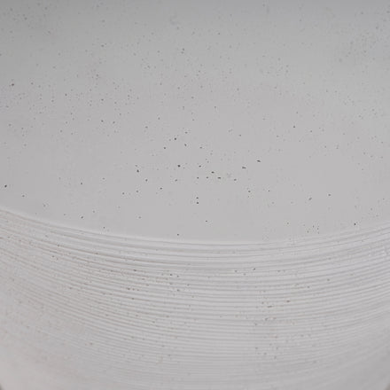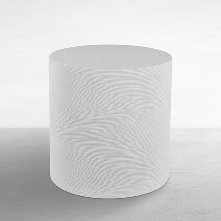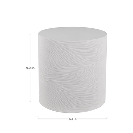 A feathery ribbed pattern encircles the Caraway Side Table, giving a pleasing texture to the circular table's cast stone base. The table is finished in a natural white hue that allows it to coordinate with a multitude of decorative styles.