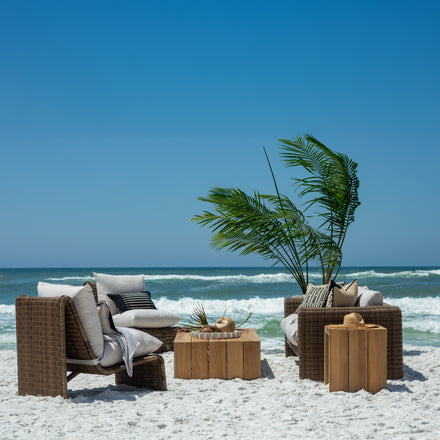 Our Messina Side Table is a contemporary masterpiece crafted from sustainably harvested teak. This table features a unique chunky waterfall design, with seamlessly aligned panels that extend to the ground. Despite its solid appearance, it's ingeniously hollowed to reduce weight, enhancing versatility without sacrificing style. Perfect for complementing various collections, its natural durability and elegant design offer timeless appeal and practicality for any outdoor space. Please note, that due to its high-quality center cut, and natural oils, teak will age gracefully without the help of cleaners and protectors.