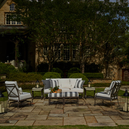 In the Monaco collection, slim, elegant silhouettes combine with gracious details. Crafted of enduring wrought aluminum, the Monaco Aluminum Sofa's refined accents, including sloping arms and the signature X-frame design, create a timeless statement.