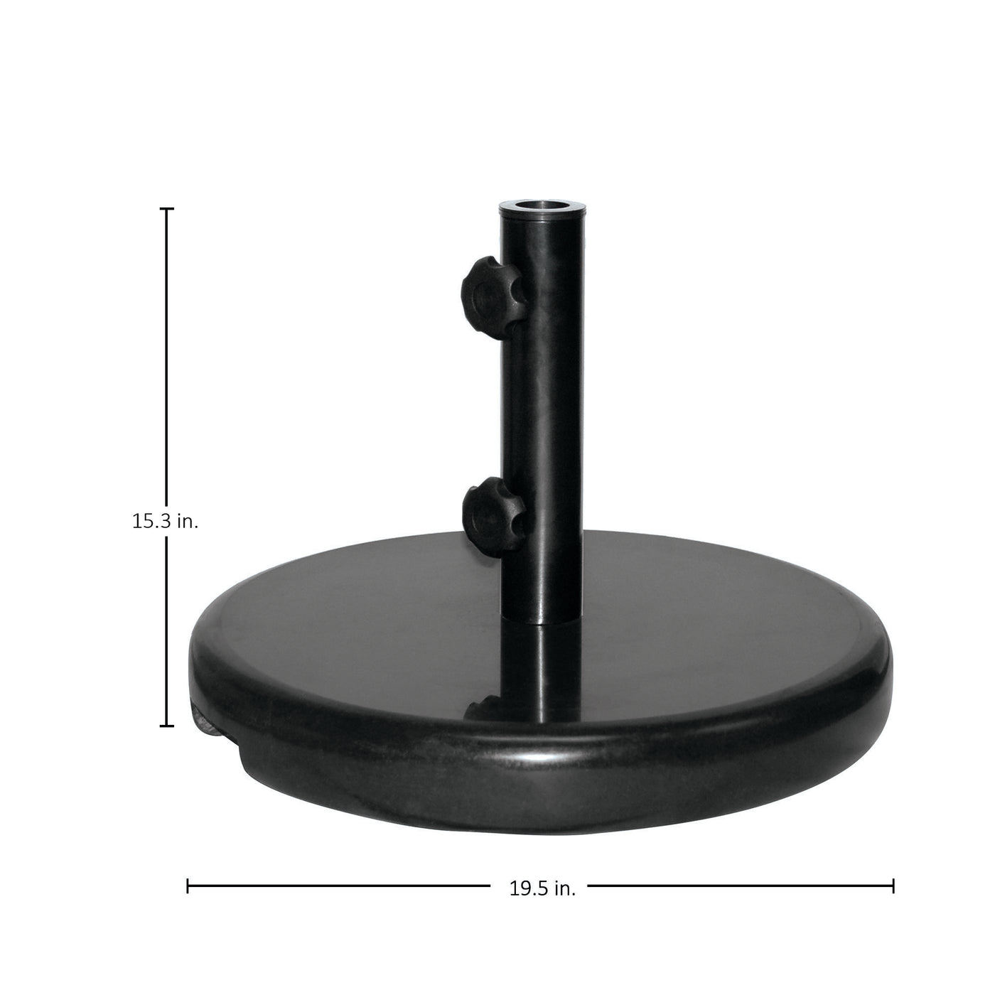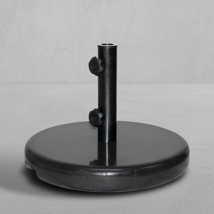 Our Ebony Granite Umbrella Base is a freestanding base featuring a polished granite design paired with wrought aluminum, delivering a solid foundation with a sophisticated edge. Measuring 19.5 inches in diameter, it's equipped with alternative sleeves to accommodate umbrella poles up to 43mm or 1.5 inches in diameter. Perfect for supporting our 9' umbrella as a stand-alone piece or anchoring a 9' or 11' umbrella through your outdoor dining table's umbrella hole, this base ensures your shade is as stylish as it is secure.