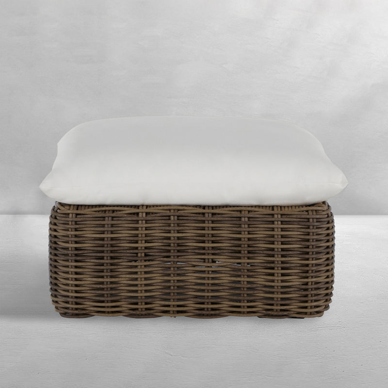 QS Montecito Resin Wicker Ottoman, Raffia with Linen Snow Cushions
