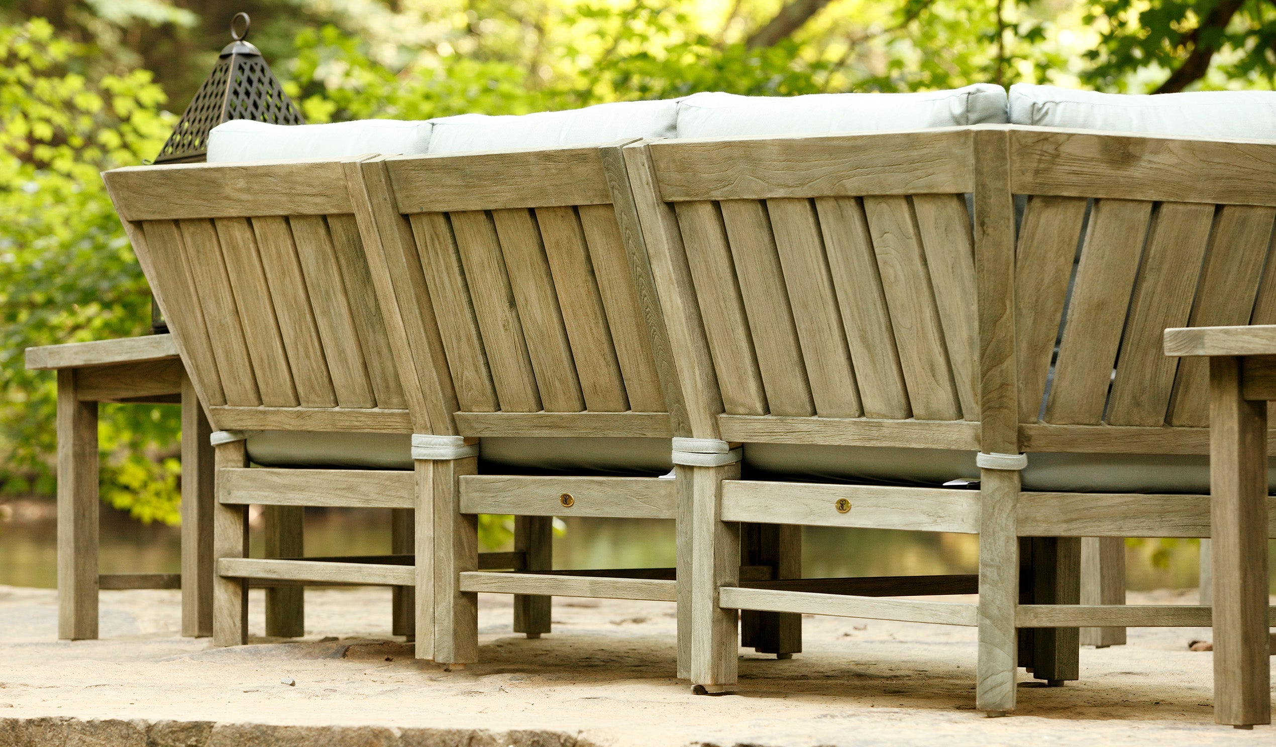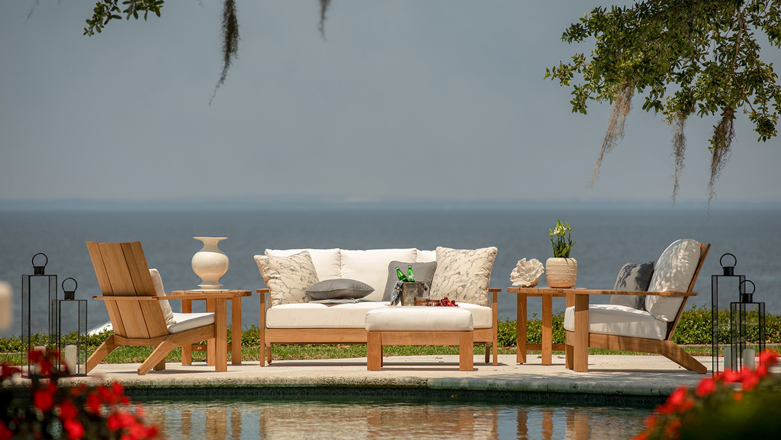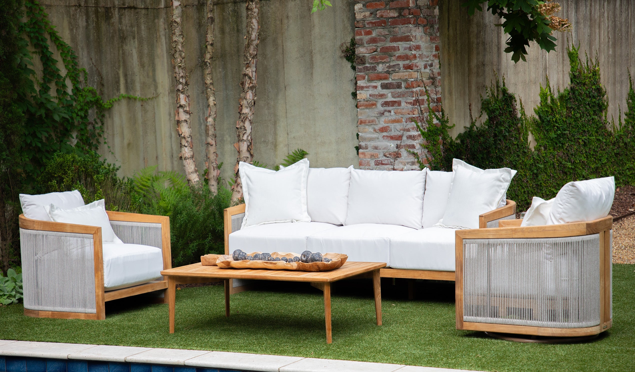 The Monterey Teak Collection offers luxurious outdoor seating with plush Dream Cloud cushions on modern teak frames. Available in Natural Teak with brass or Oyster Teak with stainless accents, it combines comfort, style, and sustainable Grade A teak craftsmanship.