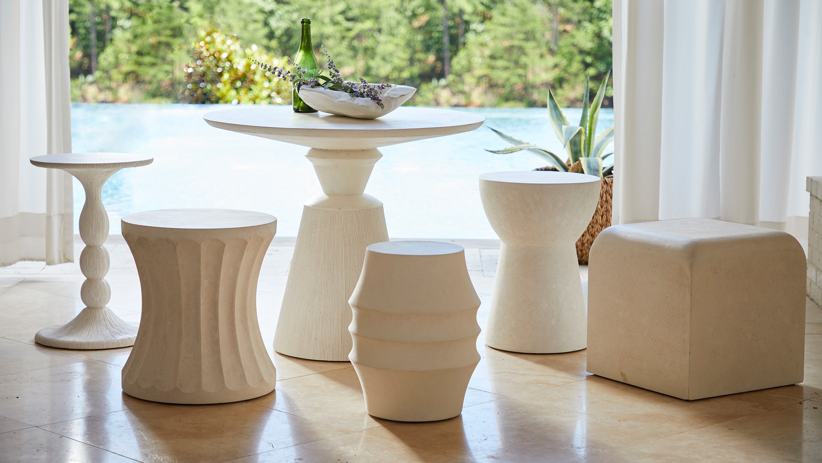 The Cast Stone Collection pairs sculptural design with sturdy functionality, featuring bold curves and textured geometry.