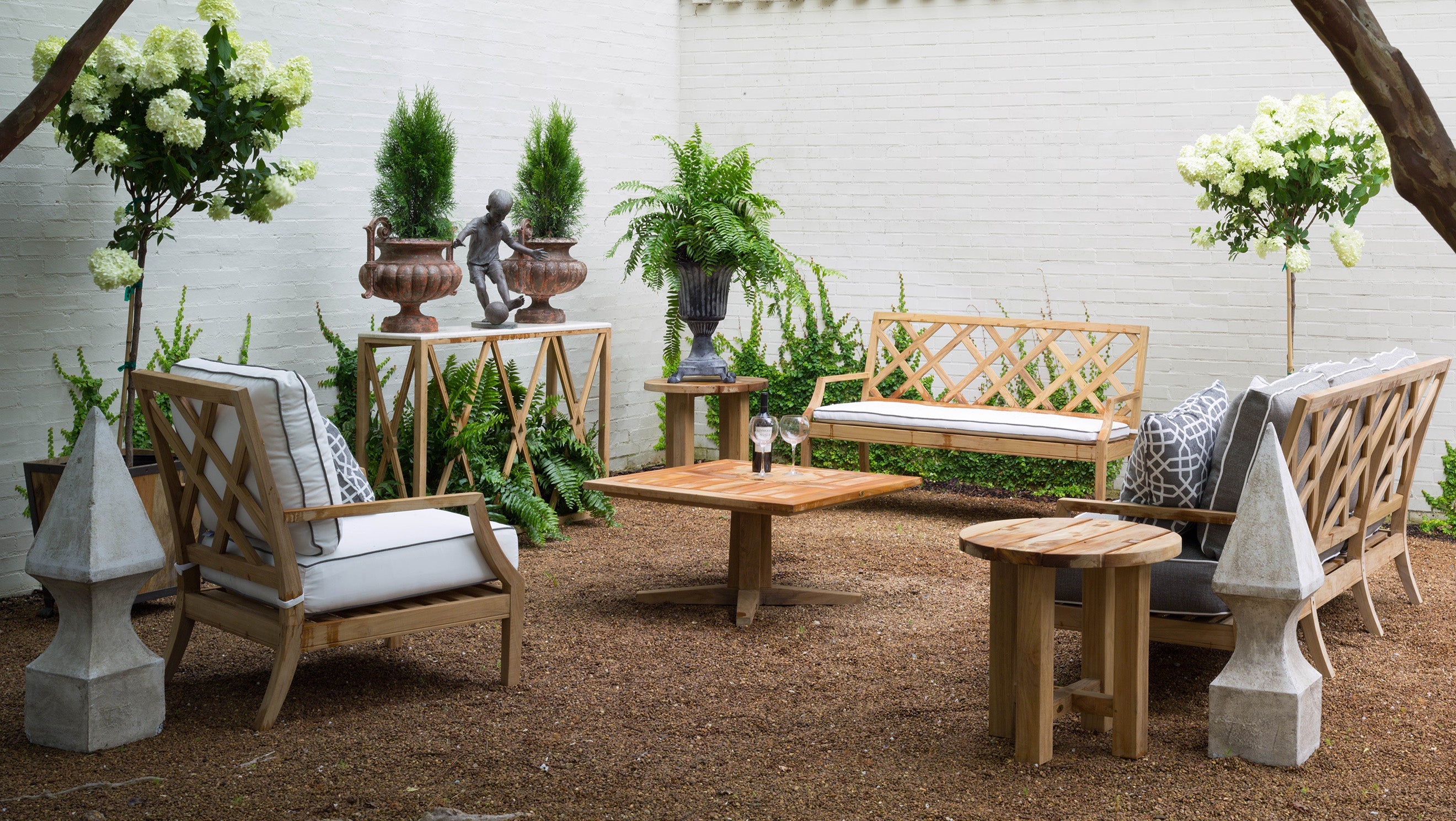 The Haley Collection features a timeless trellis-inspired lattice back, crafted from FSC-certified Indonesian Grade A teak for natural durability and water resistance. With its classic X-back design and detailed notches, Haley blends effortlessly with other teak pieces.