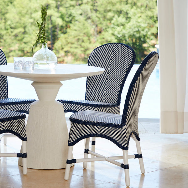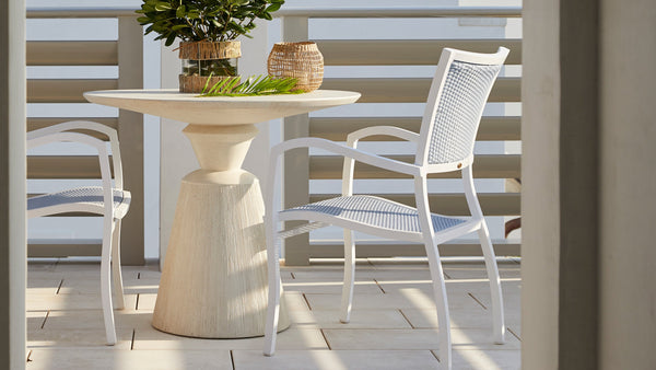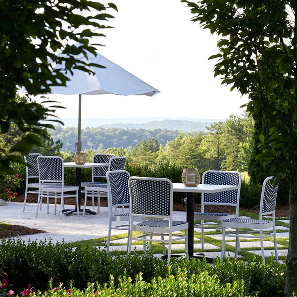 The Parc Collection captures classic yachting style with a stackable café chair featuring a crisp, two-tone woven seat—no cushion needed. Its nautical-inspired design and breezy palette offer versatile, coastal charm for any outdoor setting.