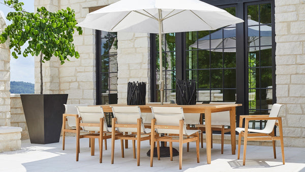 The Coast Collection blends clean, modern lines with durable materials, featuring hand-carved FSC-certified Indonesian teak, stainless steel accents, and canvas or grey Batyline™ sling upholstery. It offers timeless, sustainable outdoor sling furniture.