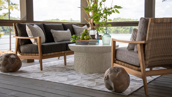 The Montauk Collection features plush cushions and textured large-wicker weave for relaxed comfort. Compact and UV-resistant with natural teak feet, it’s perfect for small patios and offers lasting, low-maintenance charm.